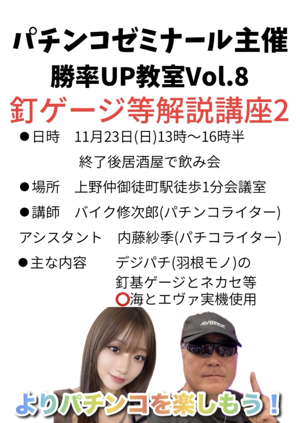第8回目は、今も昔も勝負のキモとなる釘ゲージについて深掘りします。見るべきポイントについて解説しますので、勝率UPの糧にしてください。 なお、本教室はパチプロ養成講座ではなく、一般ファンの方々によりパチンコを楽しく打ってもらう為に開催していますので、初心者の方でもお気軽に参加してください!